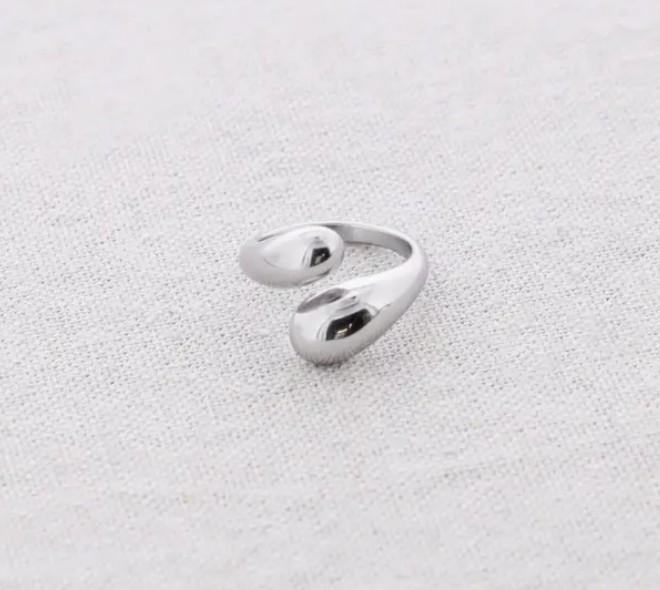 Bague en acier avec design à deux gouttes.