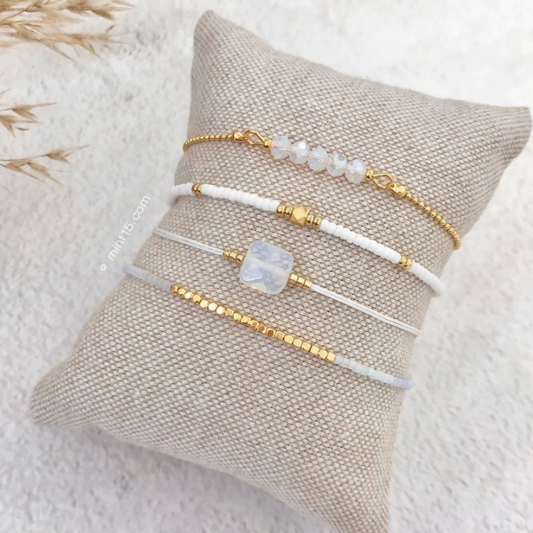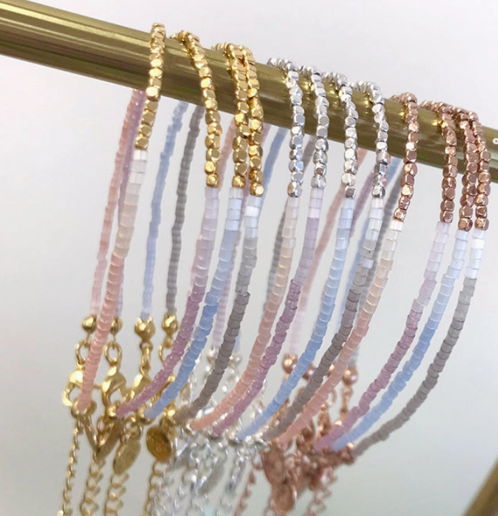 Ce bracelet fait main scintille avec de délicates perles de verre qui portent une lueur satinée.
