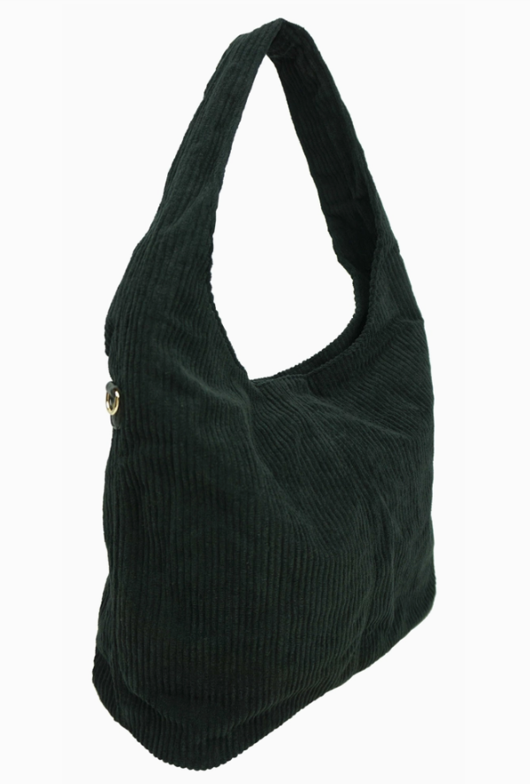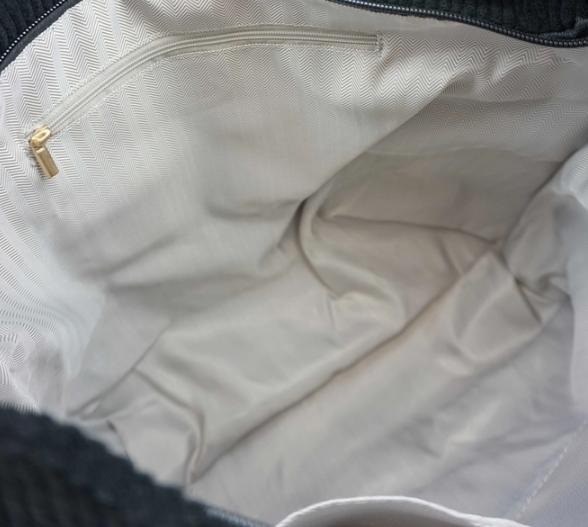 Sac velours côtelé, fermeture zippée avec une poche zippée et deux poches simples à l’intérieur.