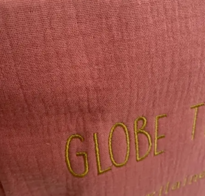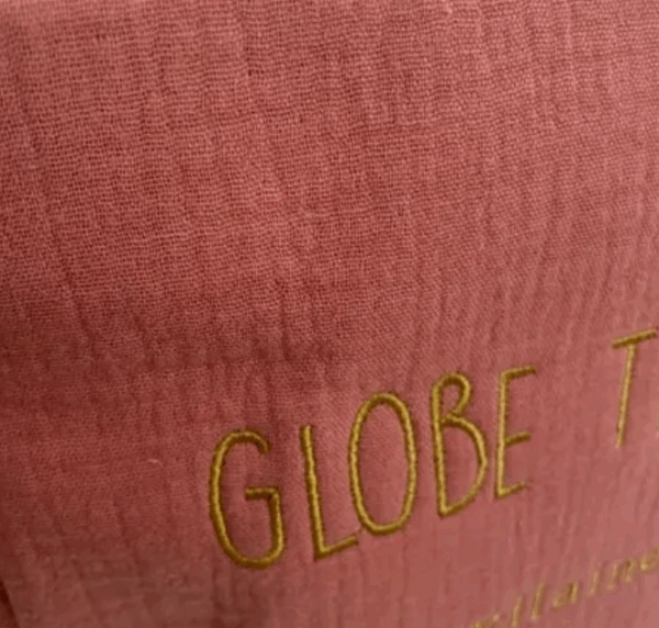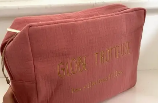 Grande trousse en gaze de coton, intérieur doublé et brodée sur une face, broderie dorée « globe trotteuse ».
